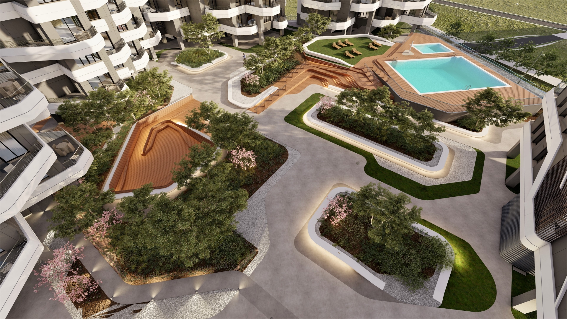 The sense of openness is ever-present, extending to an elevated green space featuring swimming pools and landscaped areas.
