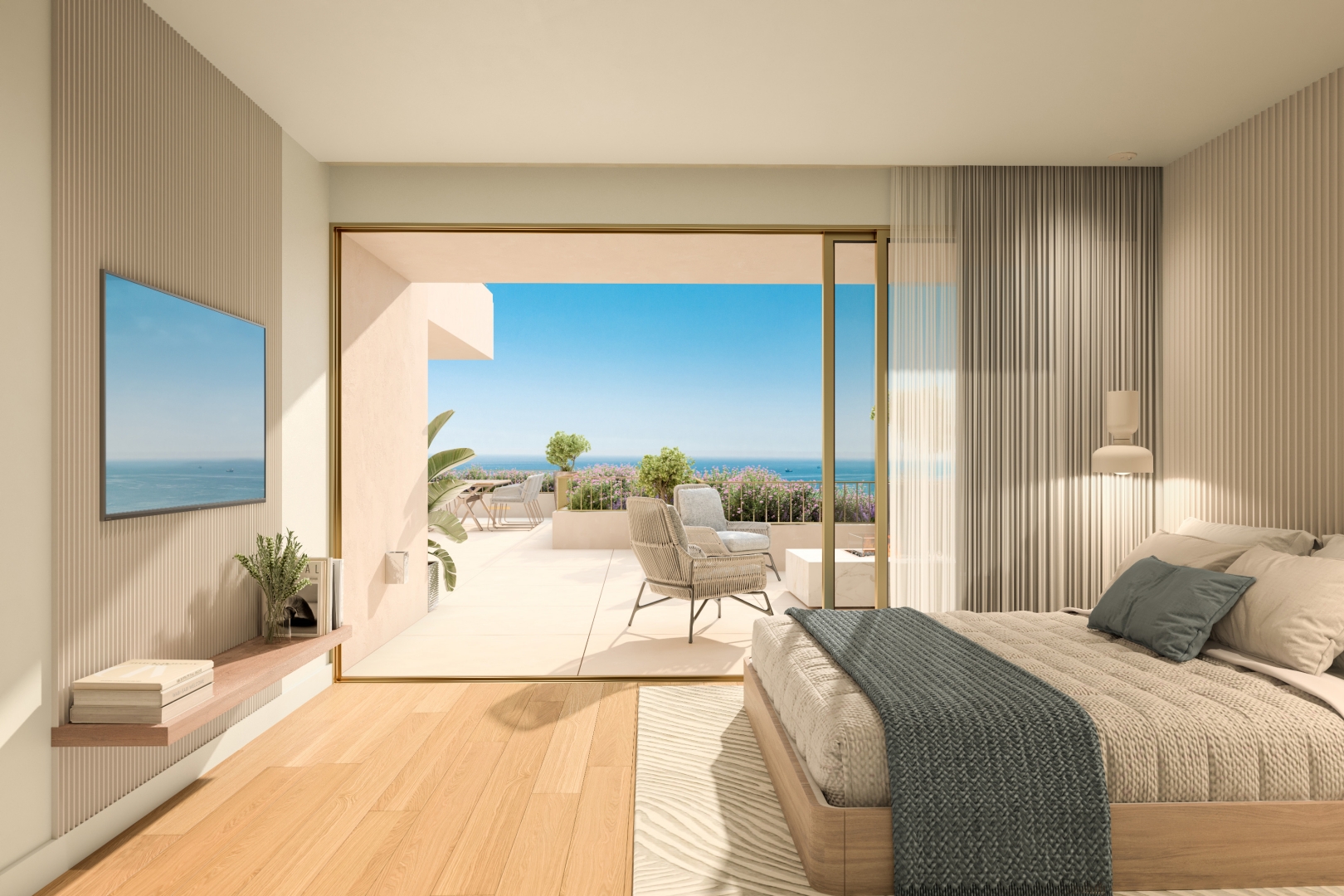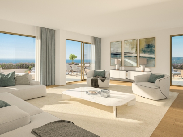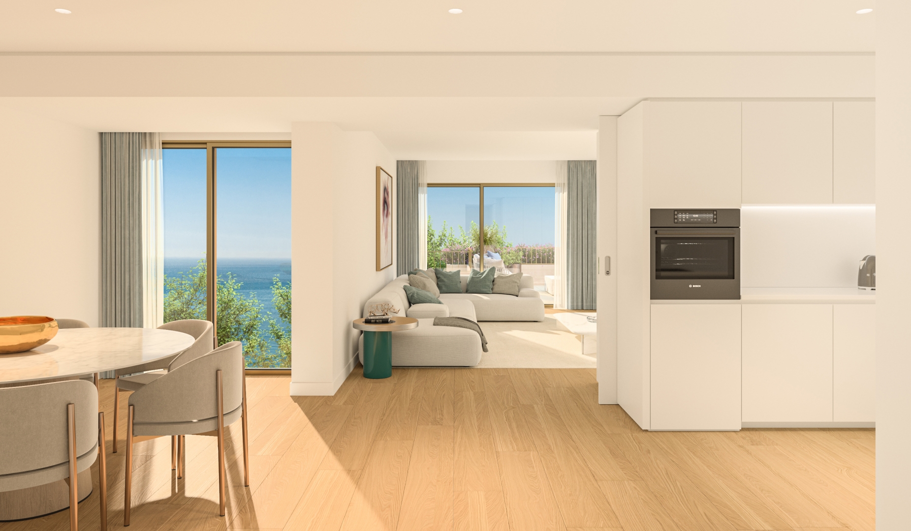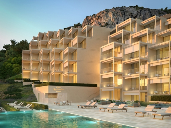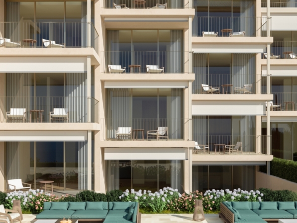 Each tourist apartment features a spacious living room with direct access to a private balcony and garden, offering unobstructed sea views. Designed with floor-to-ceiling windows and light, airy tones, these homes are bathed in natural light, fostering a serene and peaceful atmosphere.